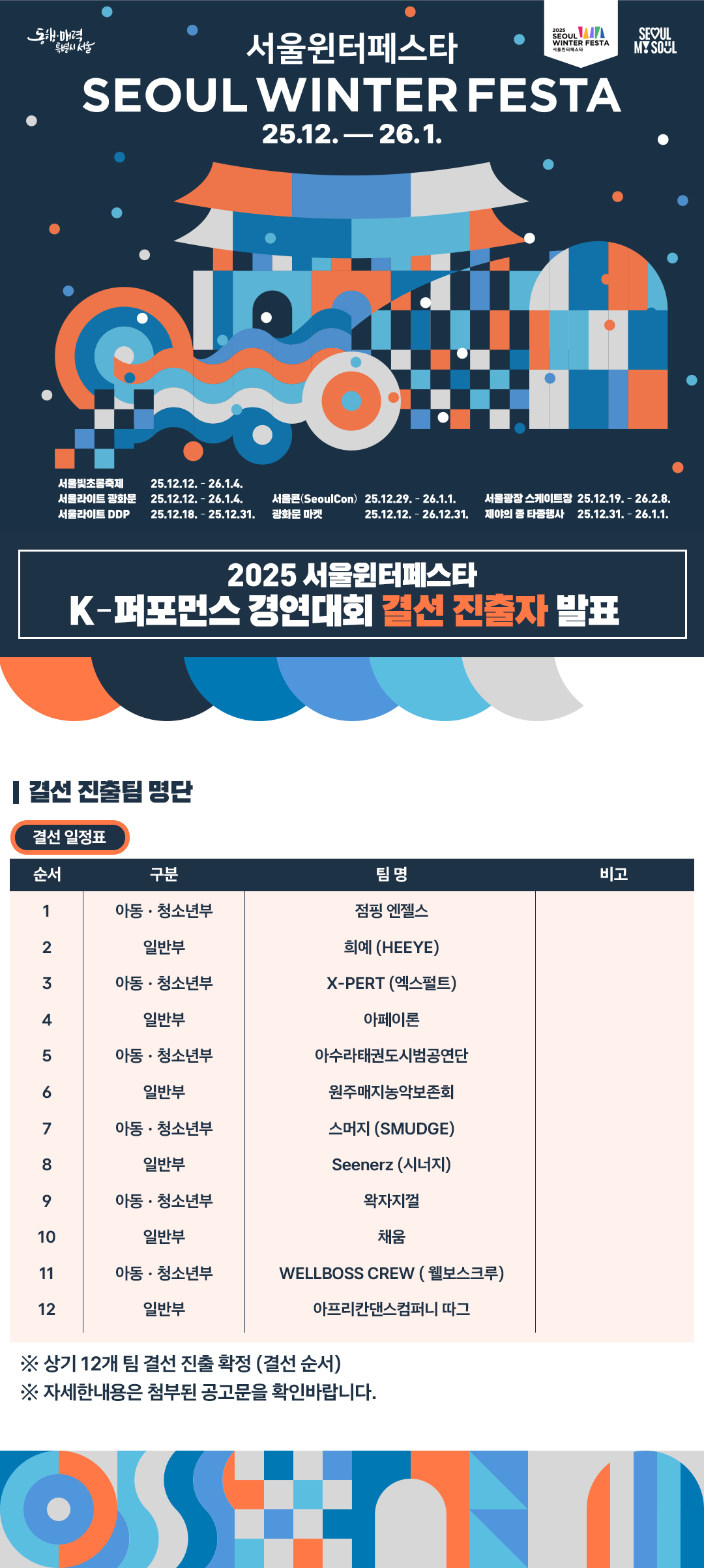 2025 서울윈터페스타 K퍼포먼스 경연대회 결선 진출팀 및 일정 공고 최종_20251220.hwp (93.5K)